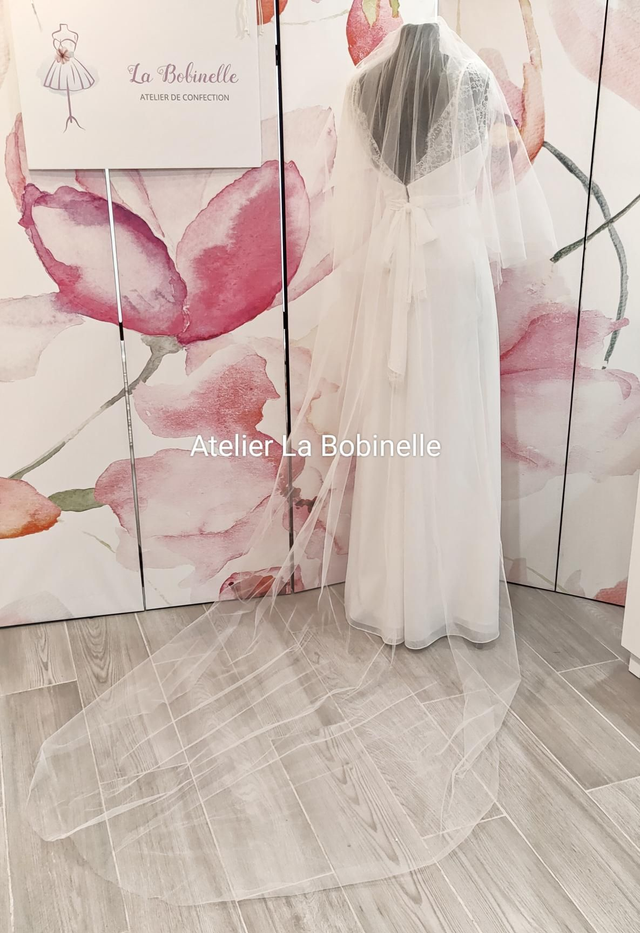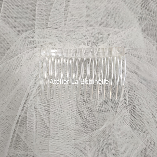 🪡🧵🇨🇵 Fabrication artisanale française de La Bobinelle : Long voile de mariée simple en tulle fin couleur ivoire. Le peigne est cousu sur le rabat.