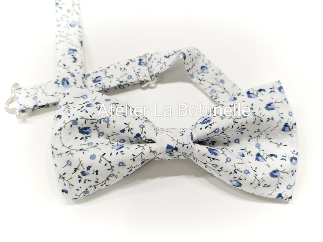 Nœud papillon en tissu coton blanc à petites fleurs bleues.