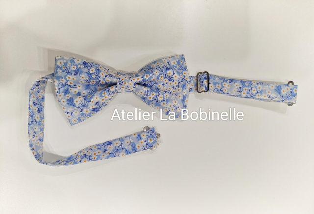 Noeud papillon en tissu coton oeko-tex Liberty couleur bleu clair avec petites fleurs paquerettes blanches.