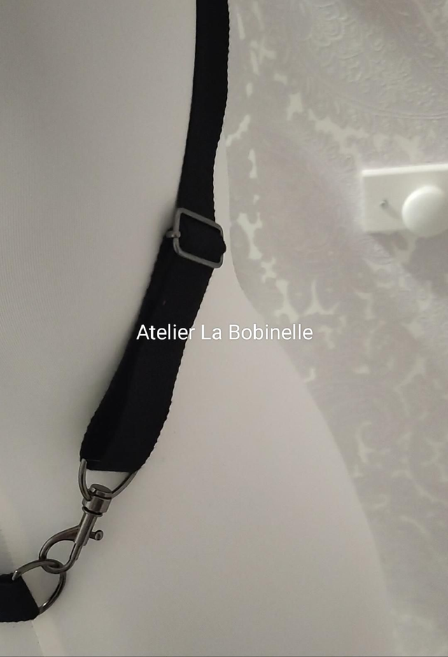 Il y a une anse noire réglable avec boucles et mousqueton sur un côté. La doublure intérieure est en tissu coton noir avec une poche.