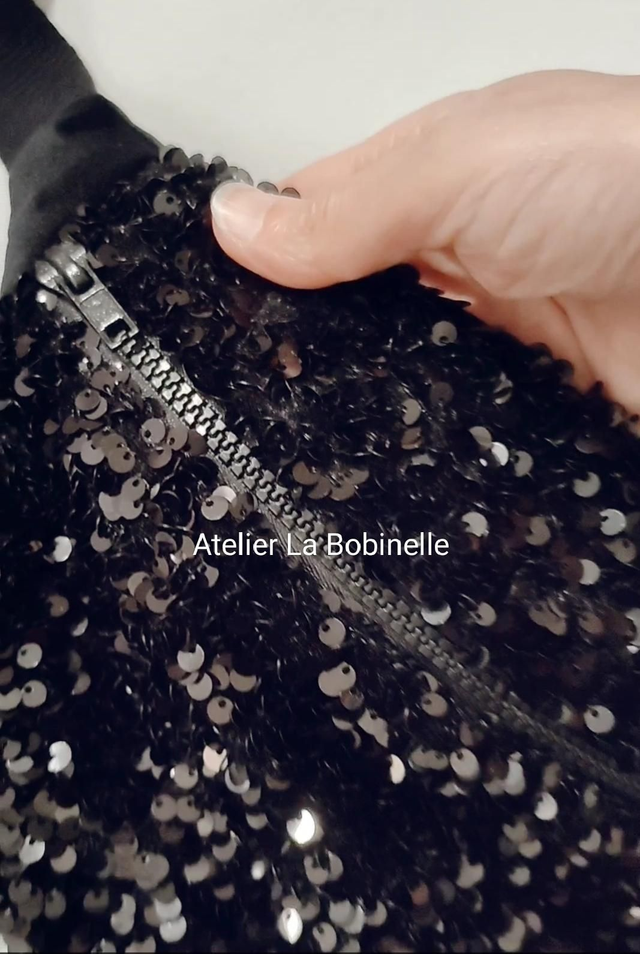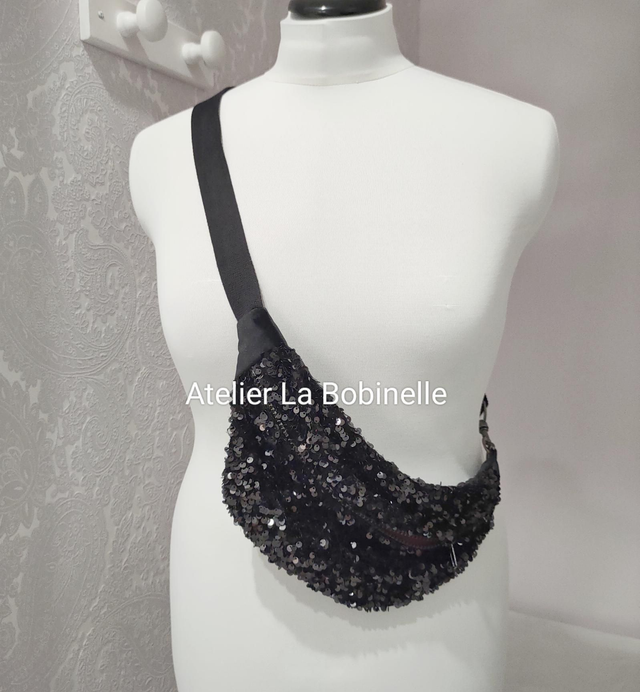 Ce sac banane est confectionné dans un tissu à paillettes ou sequins noirs sur le devant et un tissu velours de qualité au dos.