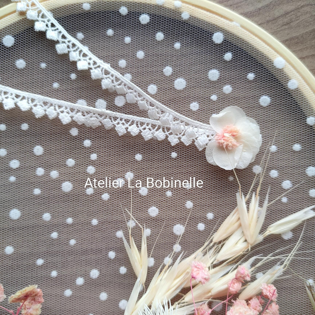 Il a été fabriqué avec un tulle plumetis monté sur un cercle à broder en bambou.