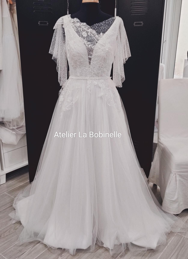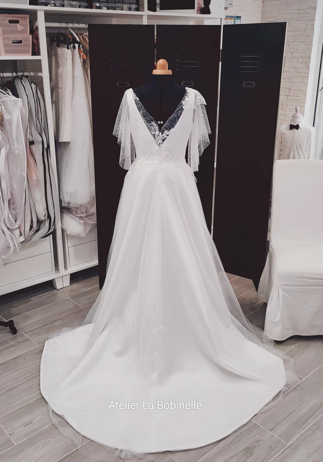 Robe de mariée nommée Florale confectionnée minutieusement à la main et à la machine à partir d'un tulle fin, d'un tissu satin et d'une dentelle florale asymétrique dentelle parsemée de perles et de paillettes.