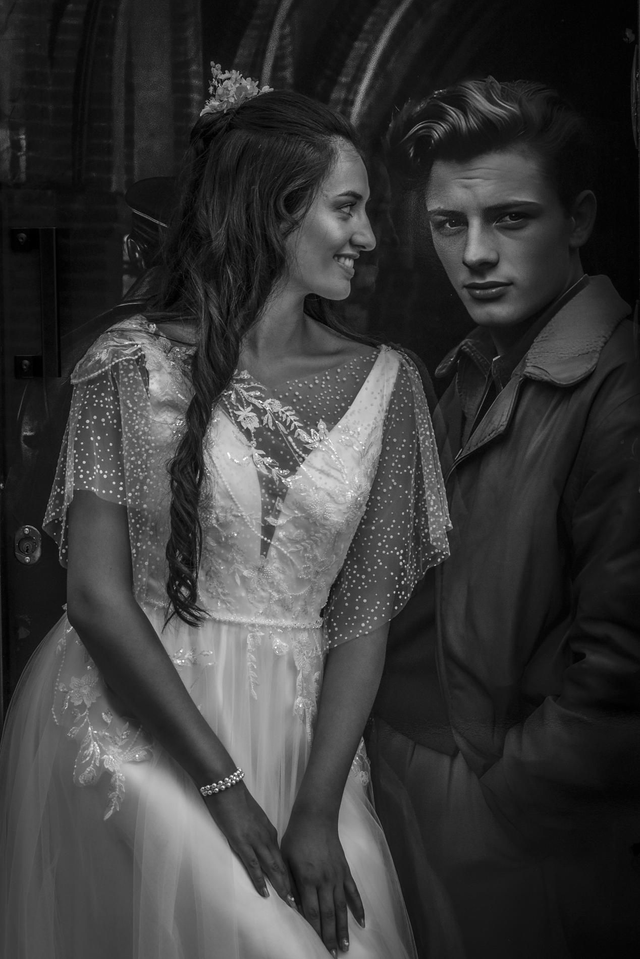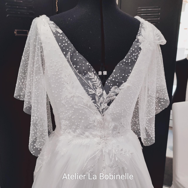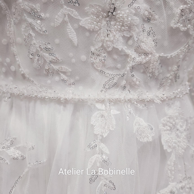 Elle se ferme au dos à l'aide d'une fermeture à glissière invisible, de petits boutons pression transparents sur la entelle pour caché la fermeture. Sa taille est soulignée d'une fine ceinture en perles sousue main.